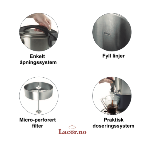 Uavbrutt flyt mulig for maksimal brukervennlighet. Lokk, filter og perkolatorslange tåler oppvaskmaskin.